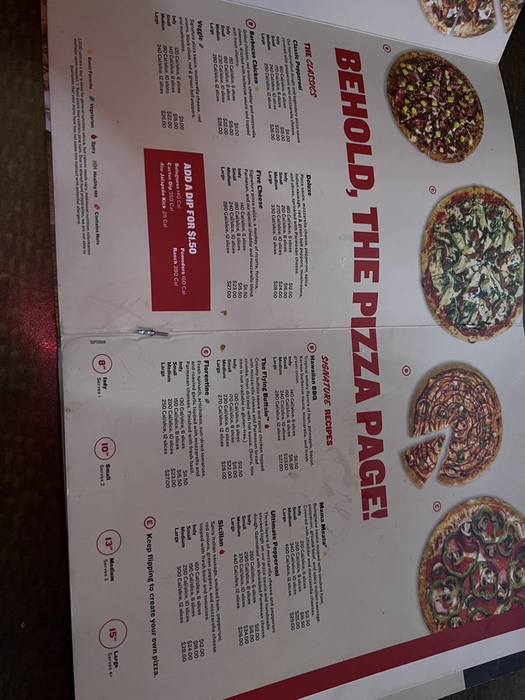 Signature pizza sauce, mozzarella cheese, red onions, black olives, red & green bell peppers, and marinated mushrooms.